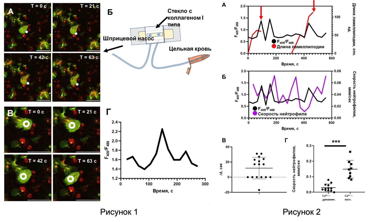 Измерение скорости движения нейтрофилов и роста ламеллиподий производилось с помощью плагина Manual Tracking программного пакета ImageJ. Измерения проводились только для движущихся нейтрофилов. Линейную скорость роста ламеллиподии измеряли по координатам края движущейся клетки аналогично работе [24] (рис. 1А). Измерения уровня флуоресценции Fura RED производилось с помощью ImageJ вручную (рис. 1В,Г). Для каждого кадра, область измерений представляла собой круг диаметром 4 мкм в геометрическом центре клетки и выбиралась вручную (Рис. 1В, Видео S1).